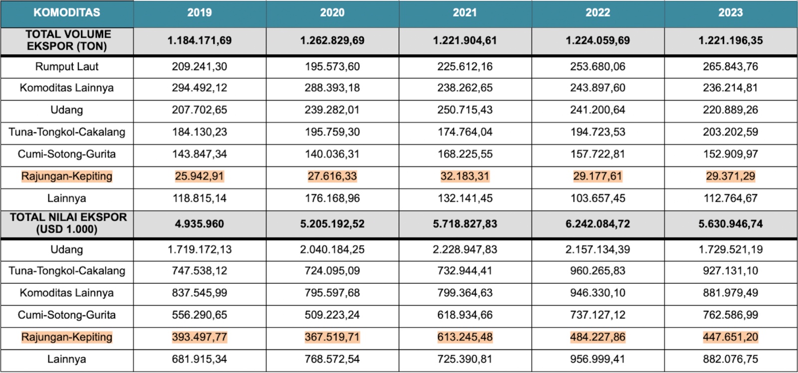 Seperti terlihat pada tabel di atas, rajungan merupakan komoditas perikanan yang berkontribusi cukup besar terhadap total volume dan nilai ekspor perikanan Indonesia.